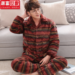 潮富世家睡衣男秋冬季家居服珊瑚绒法兰绒加厚加绒长袖三层夹棉厚