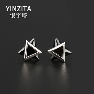925纯银六角黑白锆石耳钉韩版潮男女三角情侣耳饰一对学生日礼物