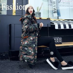 棉衣女中长款大版2017新款宽松加厚羽绒棉服冬装大毛领外套迷彩服