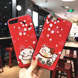新年刺绣招财猫iphoneX手机壳苹果7/8plus女款闪粉挂绳6s全包防摔