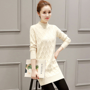 沫晗依美2017春秋韩版中长款半高领提花显瘦毛衣纯色套头针织衫
